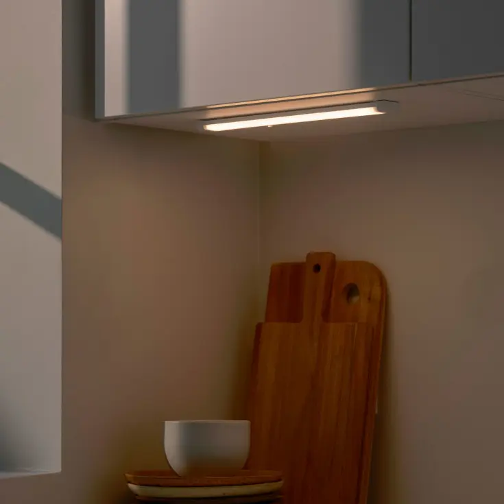 Preston to ultracienka listwa oświetleniowa, idealna do montażu pod szafkami lub półkami. Możesz wybrać między białym a zimnym białym światłem, naciskając przycisk na oprawie.